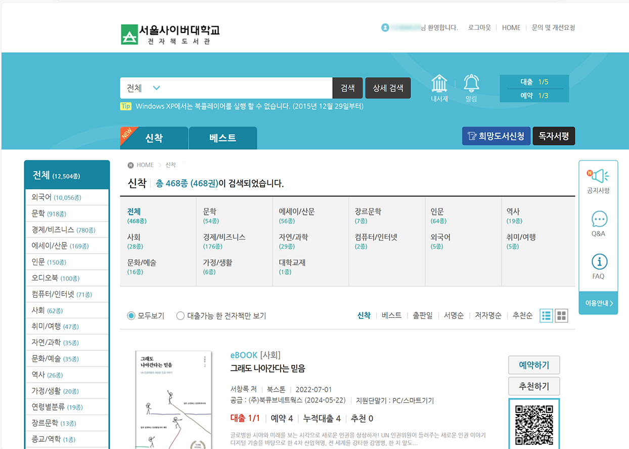 학교에 종이 책을 비치한 도서관이 있는지는 잘 모르겠고, 전자도서관이 있다. 작년에 입학한 뒤 둘러봤을 때는 장서가 너무 빈약하고 낡아서 실망했는데, 얼마 전에 책이 제대로 된 책이 들어왔다.