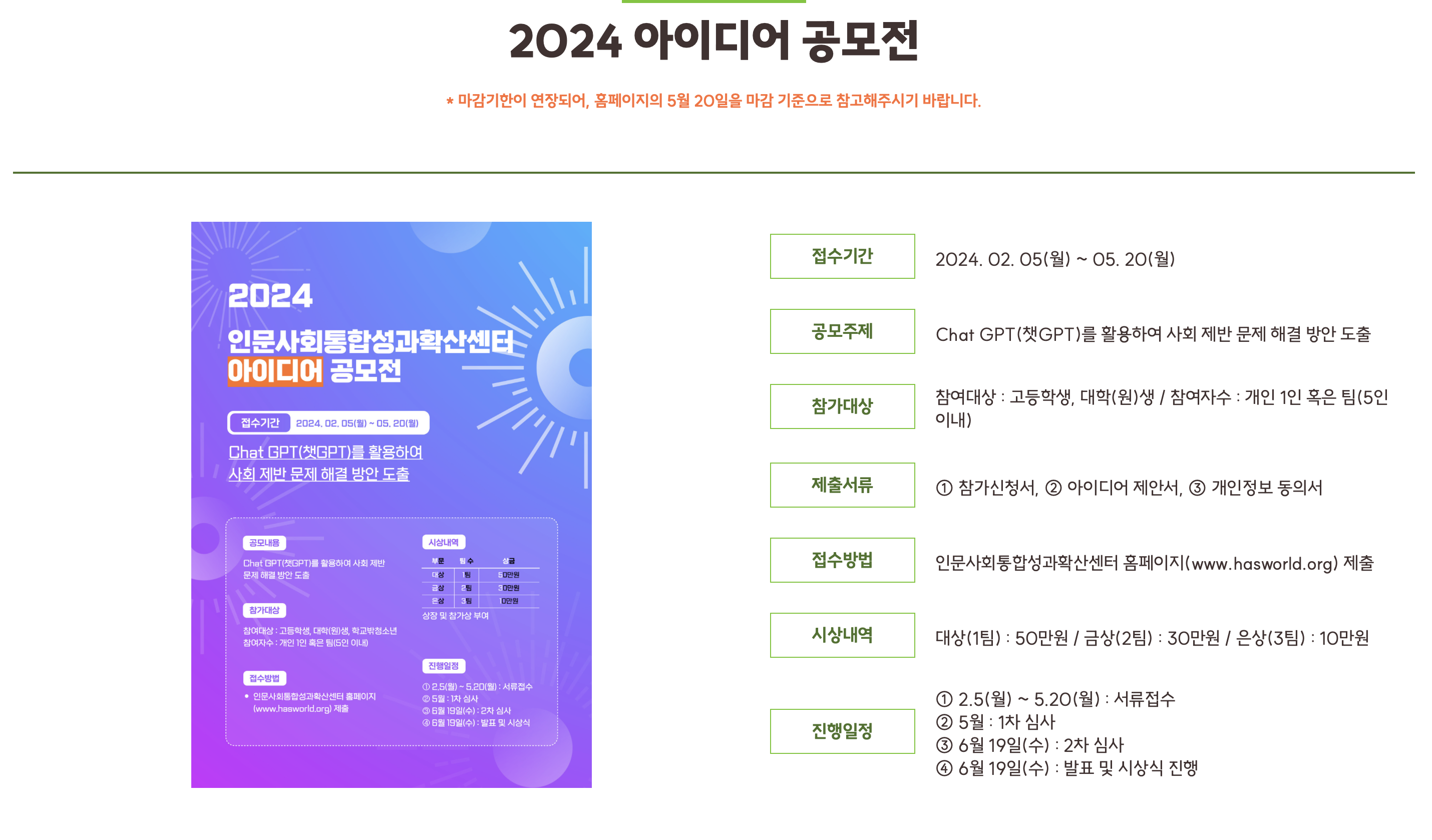 두 달 쯤 전에 문득 ‘챗GPT 관련 공모전이 있지 않을까’라는 생각이 들어 찾아보니 인문사회통합성과확산센터에서 진행 중인 것이 있었다. 응모하기 전에는 이런 기관이 있는지도 몰랐다.