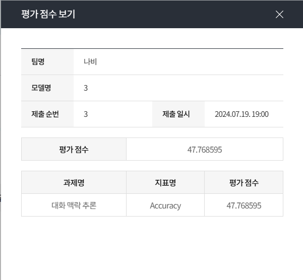 어제 제출한 결과를 확인해 보니 76점 정도 나왔다. 베이스라인 코드에서 제시한 것보다 점수가 낮다. 학습할 때 양자화해 놓고 추론 시에는 양자화를 고려하지 않은 것이 원인일까?