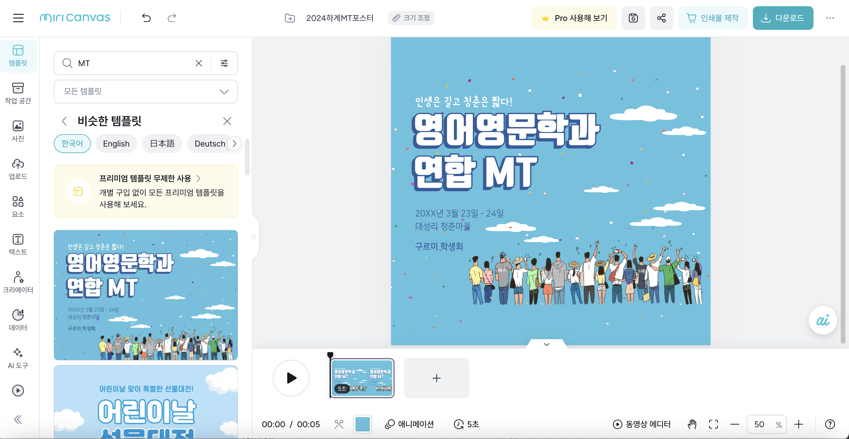 "MT 포스터 만드는 법"으로 검색하니 미리캔버스를 소개하는 유튜브 영상이 나온다.