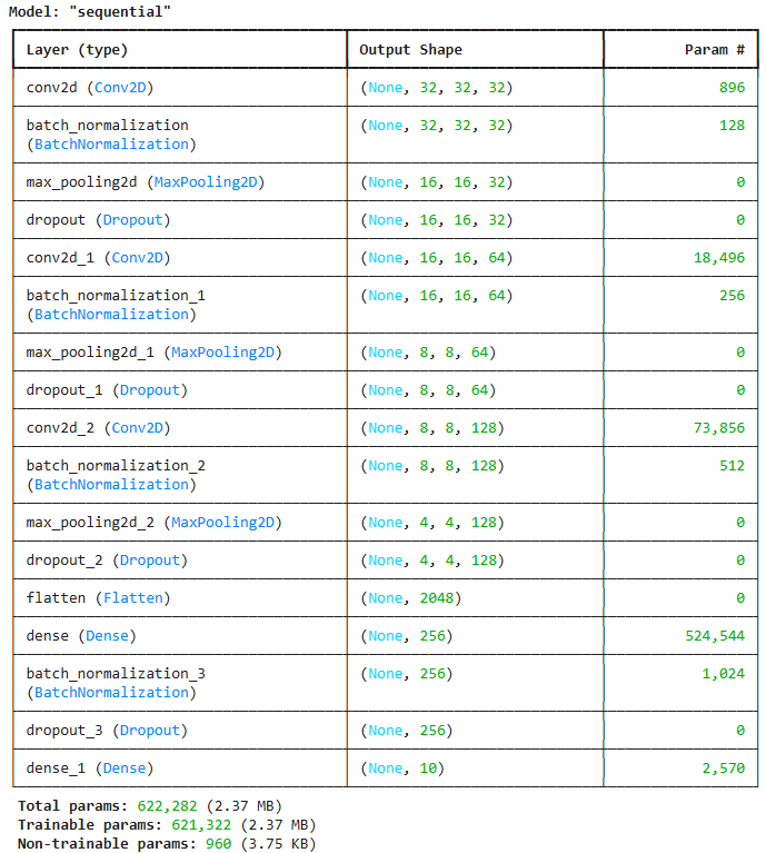 - Dense 레이어 2개 (뉴런 수: 256, 10), 첫 번째 Dense 레이어 뒤에 BatchNormalization 및 Dropout (비율: 0.5)