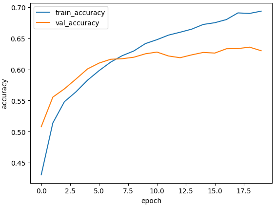 - 학습 정확도와 검증 정확도가 에포크가 진행됨에 따라 서서히 증가하지만, 60% 초반에서 정체되었다.