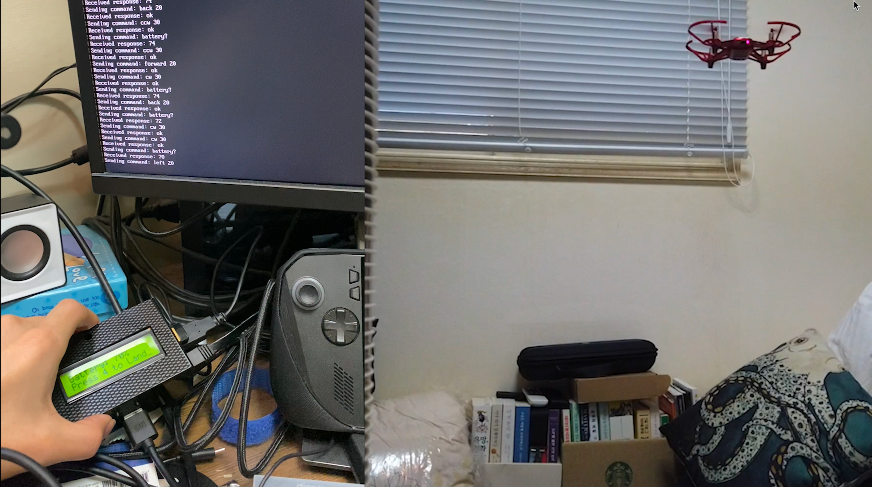 DJI Osmo Pocket으로 드론이 나는 모습을 찍고, 나는 오른손에 아이폰을 들고 촬영하며 왼손으로 PiFace CAD의 버튼을 조작해 드론을 조종했다.