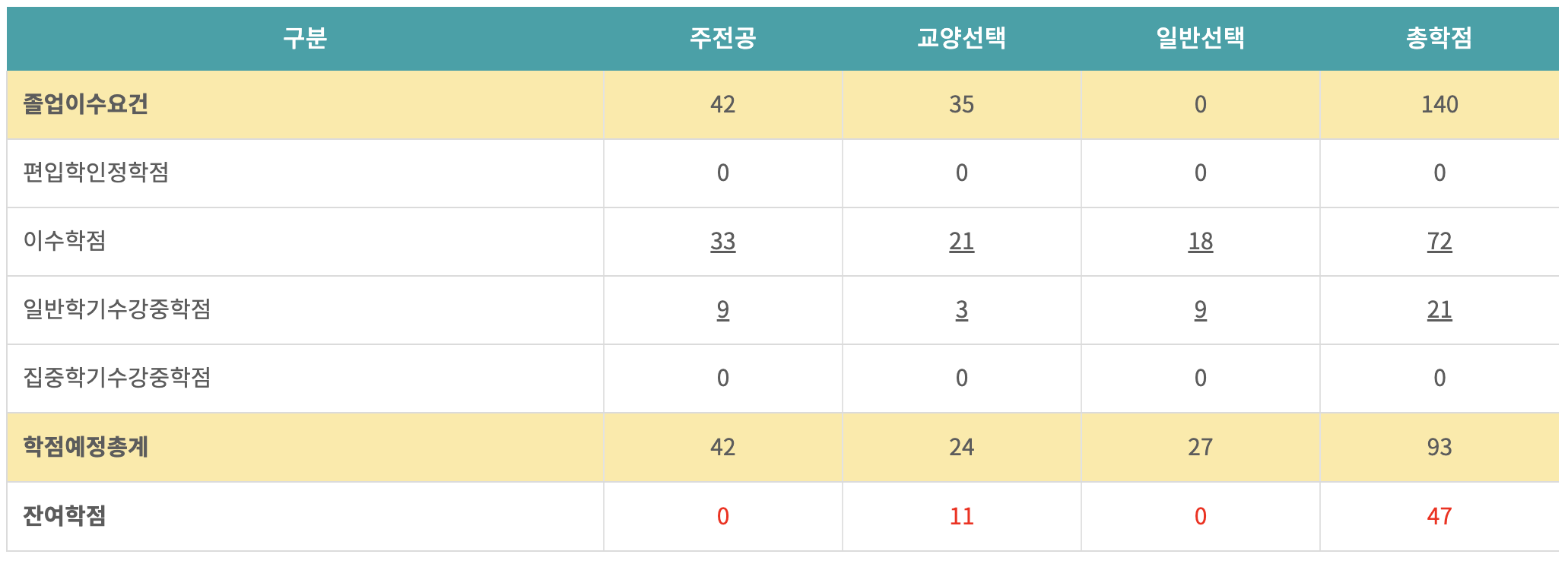 계절 학기에서 어느 과목을 수강할지 정하기에 앞서, 졸업이수요건을 확인했다.