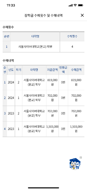 장학금 수혜횟수 및 수혜내역 조회를 해봤다.