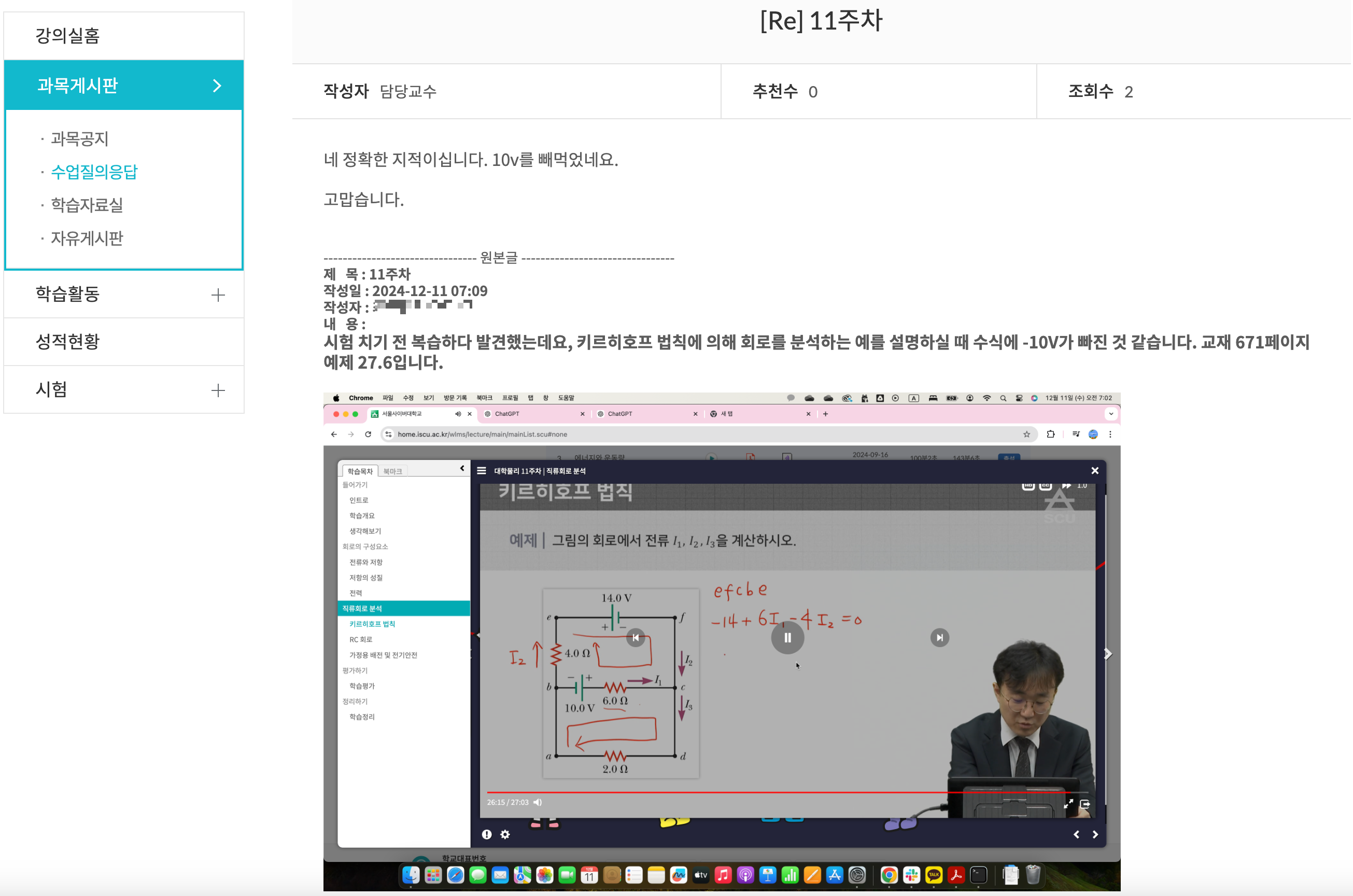 그러고 아침에 일어나 잠깐 복습하다 보니, 교수님이 설명하다가 수식에서 항을 하나 빼먹은 것이 보여 질문답변 게시판에 올려두었다.