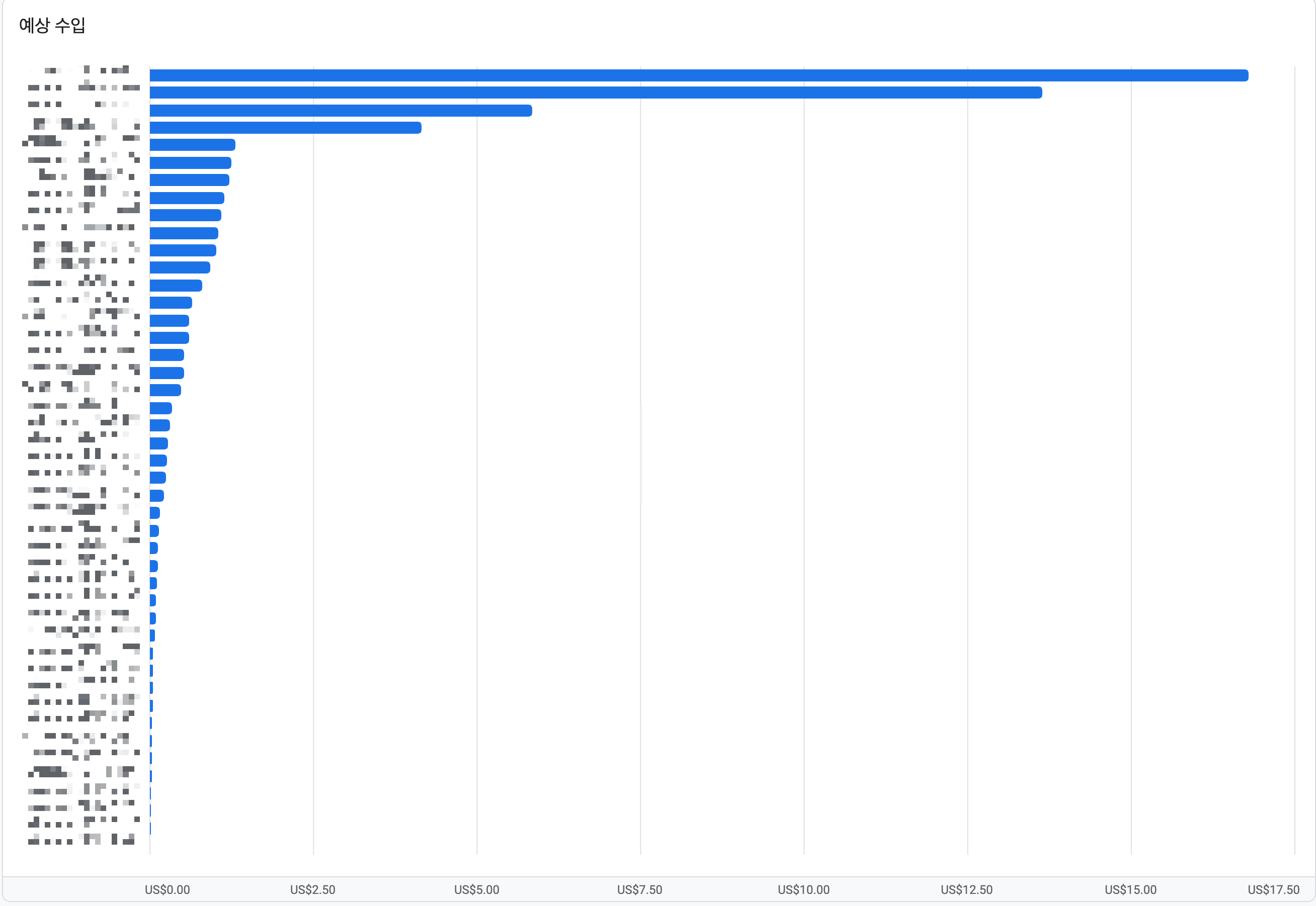 한때는 이 차트의 맨 위에 올라간 것만큼의 수익을 창출하는 광고 단위를 백 개쯤 보유하면 돈 걱정을 크게 하고 살 수 있으리라는 생각을 했다. 예를 들어, 한 달에 십 만원씩 벌어오는 콘텐츠를 백 개 가지고 있다면, 매달 천 만원의 수익이 생긴다는 계산이었다. 하지만 차트에 드러나듯 이상과 현실의 괴리가 크다.