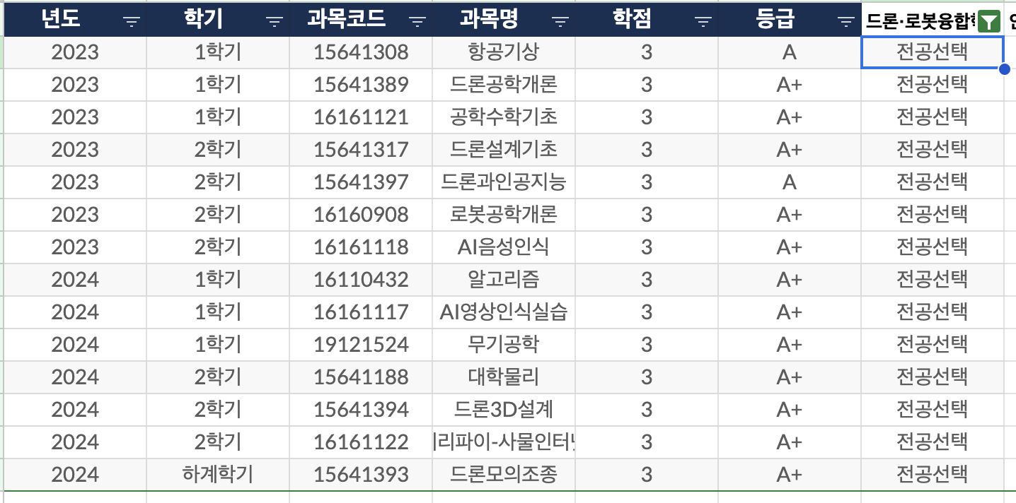그건 그렇고, 드론·로봇융합학과 전공선택 과목만 봤더니 14과목 중 12과목이 A+, 나머지 2개가 A 등급이다. 참고로 이 중에도 인공지능 관련 과목이 몇 개 있긴 한데, 인공지능학과에 개설되지 않은 과목이라 복수전공 할 경우에 전공으로 인정받지 못한다.