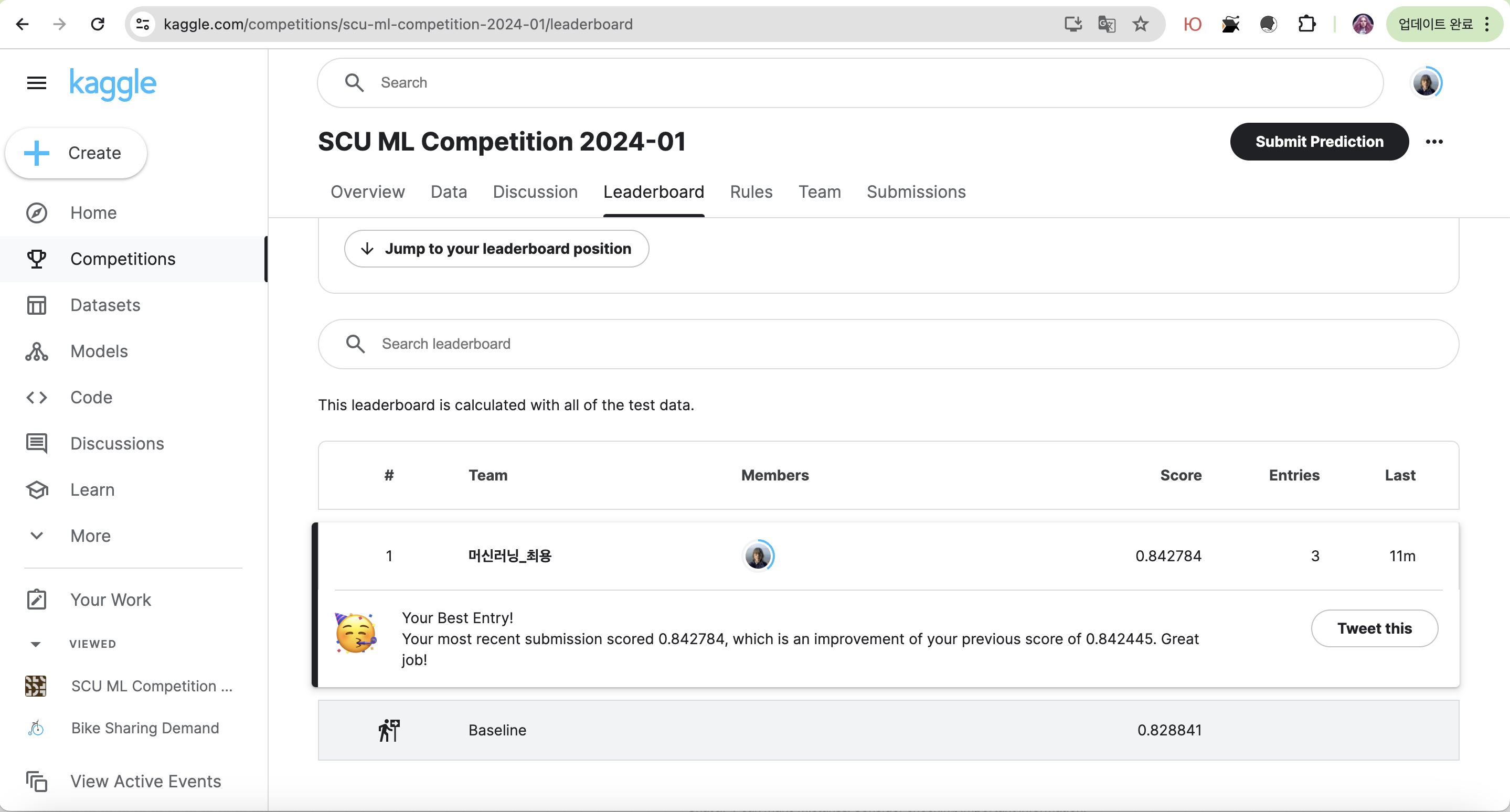 과제가 공지됐다.학기초에 안내한 대로 캐글에 대회가 열렸고, 순위에 따라 과제 점수를 받는다. 상위 입상자에게 상품까지 걸렸다!어젯밤에 몇 가지 시도해 봤지만 전혀 소득이 없었는데, 오늘 다시 해보면서 점수를 조금 올릴 수 있었다.내가 처음으로 제출했다. 수업을 듣거나 책 교정하느라 대회에 형식적으로 참가해 본 적은 있어도 실질적으로 코드를 개선하는 노력을 해본 것은 이번이 처음인데, 점수를 높이는 방법을 궁리하고 실험하는 과정이 꽤 재미있다.대회 기간 동안 새로운 내용을 배우거나 좋은 아이디어가 생길 때마다 개선하려고 한다.