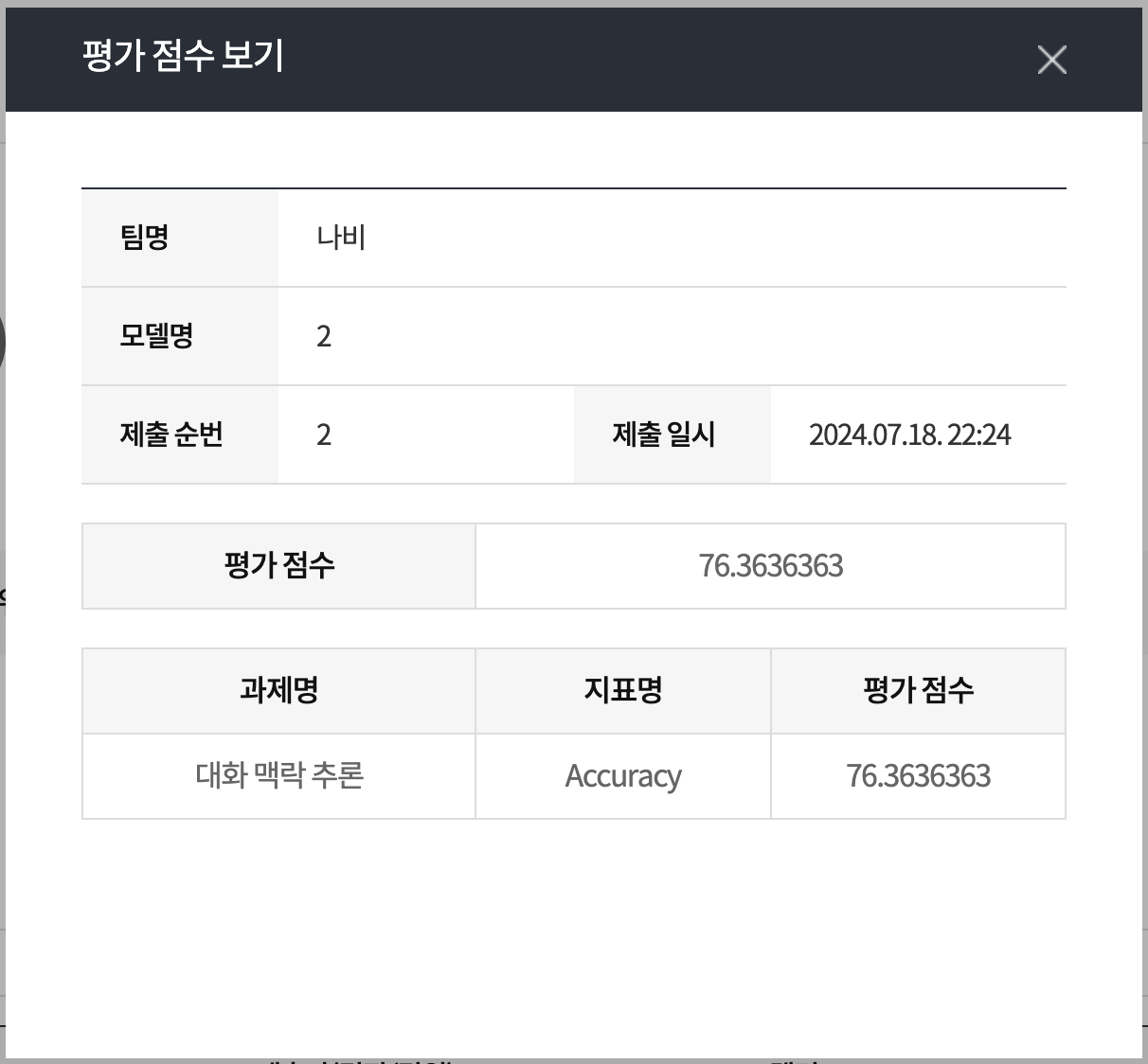 아직 결과가 안 나왔다. 그런데 리더보드를 보니 절반 이상의 팀은 베이스라인 bllossom-8b-sft 점수 87.1074380조차 넘지 못하네